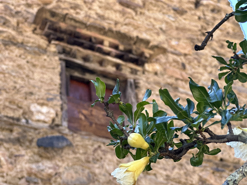 彩色鋪裝的通村路兩邊,成片的苞谷林正在背紅纓,風(fēng)中響著緊密結(jié)實(shí)的聲音。各種果木枝繁葉茂,結(jié)滿了寶石般紅紅綠綠的果子。一排柴垛上方,伸出很大一片橙色的小果子,沒有葉子,我們像賞花一樣欣喜于它的紅艷。嘉絨姑娘悄默地走在我們身邊,她的手里擺弄著一片草葉,安靜而美好,是感到這一路上的莊稼果木已經(jīng)足夠繁盛。