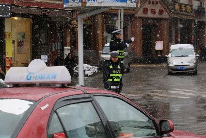 在將軍橋,為方便車輛順利通行,三名交警們一大早就上崗了。雖然雪仍然下著,但交警站在指揮臺(tái)上,認(rèn)真指揮著過往車輛。