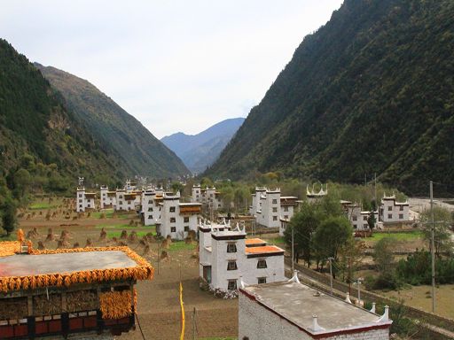 走進(jìn)冬日的丹巴縣革什扎鄉(xiāng)三道橋村,一幅如詩如畫的鄉(xiāng)村美景映入眼簾:一排排新穎別致而獨(dú)具嘉絨特色的白色藏房鑲嵌在彎彎的革什扎河旁,格外耀眼。一條條平直寬敞的硬化路像一根根潔白的哈達(dá)連接家家戶戶,寬敞平坦的公路上,轎車、農(nóng)用車、拖拉機(jī)穿梭來往,別具一格的村民活動中心紅旗迎風(fēng)飄揚(yáng)。 這是如今的三道橋民族團(tuán)結(jié)新村。