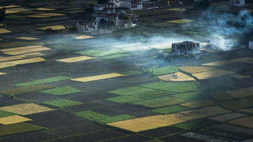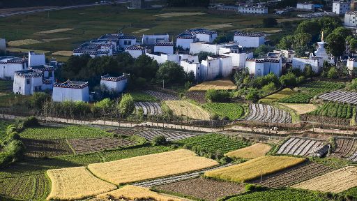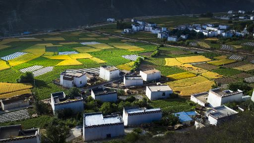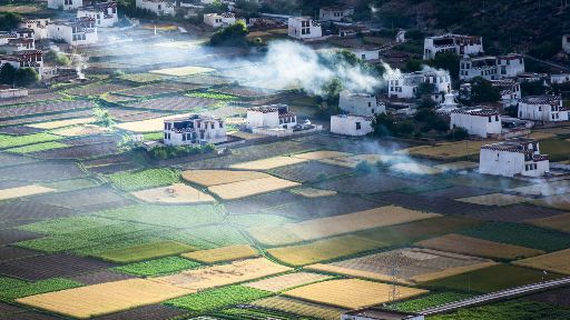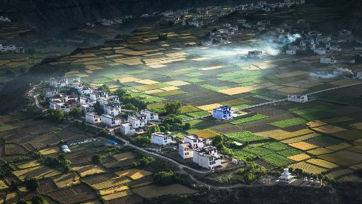 清晨,瓦藍(lán)瓦藍(lán)的天空云霧繚繞,周?chē)木拔镆黄鼥V,就好像童話(huà)里的仙境,一會(huì)兒,太陽(yáng)從東邊冉冉升起,霧也漸漸消失,村子里屋頂上飄著裊裊煨桑的煙子,我站在山岡上從高處向下俯望,只見(jiàn)高山峽谷之中,層層翠綠的梯田簇?fù)碇l(xiāng)城特有的白藏房,山下的田野,就像一片金色的海洋,將秀麗的田園裝扮得更加如詩(shī)如畫(huà)。一陣晨風(fēng)吹過(guò),麥田上蕩起了一道道金色的波紋,遠(yuǎn)處傳來(lái)了畫(huà)眉鳥(niǎo)的歌聲,我被眼前的一切迷住了,仿佛一切都靜止了,她讓我的夢(mèng)從這里開(kāi)始。