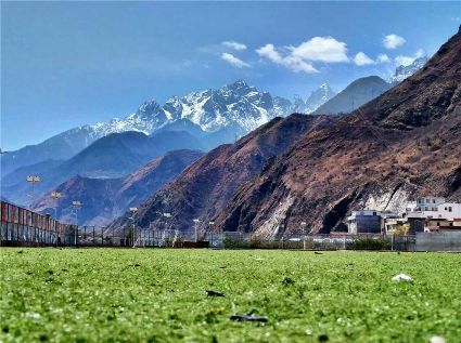 天空像剛被浸染的綢緞,蔚藍(lán)的主色已經(jīng)略顯;白雪好似從浸染的綢緞上滴落下的顏料與其它顏色的混合,眷戀的駐足在山尖,在其耳旁傾訴來年的約定;一顆顆萬年青穩(wěn)穩(wěn)的站立,將山中的寺廟、亭閣緊緊地包圍,見證著康定四季輪回的變化;依然披著秋冬贈予黃色外衣的樹木,拋開桎梏,堅(jiān)守在一座座樓房旁。藍(lán)與白,黃與綠……這大美的晴天為人們帶來了別樣的視覺盛宴。