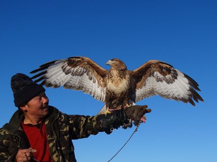 “小一點的鷹好訓,訓老一點的叫熬鷹。 開始熬鷹前,一次性喂飽鷹,七天七夜不吃不喝不睡覺,待七天時到,放鷹于空,手中拿肉,用我們倆特殊的交流方式指揮它,這時它會落我的手臂上。但是,這一只始終沒服過我。訓出來一只大約半月左右?!庇桗椚苏f。