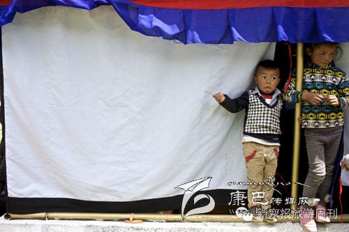 白玉縣,拉沙石的馬幫。 白玉縣,德沙村一民居內(nèi)孩子在帳篷邊玩耍。