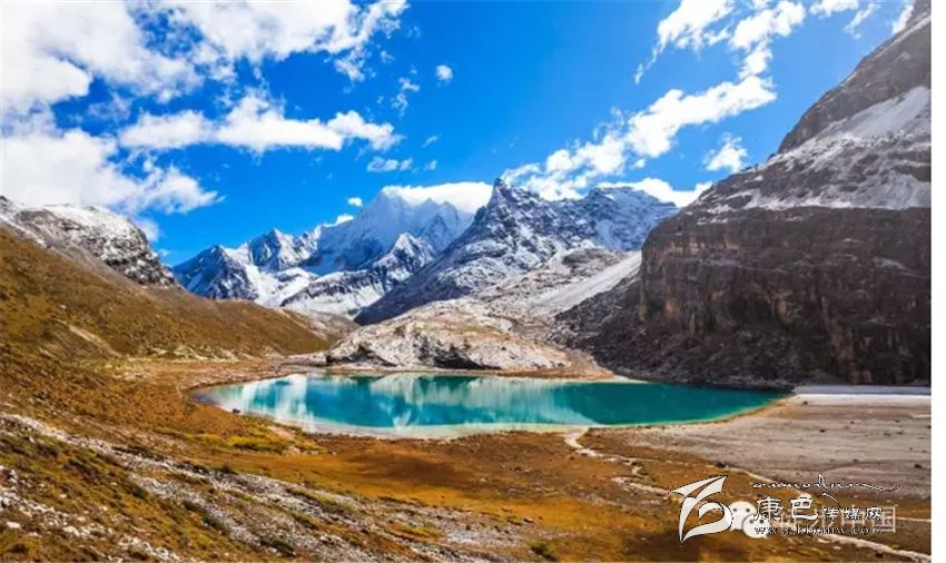 三神山中間的牛奶海,美麗的高原堰塞湖,面積0.5公頃,海拔4500米,四周雪山環(huán)繞,湖水清瑩碧藍(lán),山上成瀑,以其玲瓏秀雅水色翠藍(lán)而著名,牛奶海上方有大片的冰川。傳說每年春暖花開之時,湖水會像牛奶一樣潔白如瓊漿,并因此得名牛奶海。