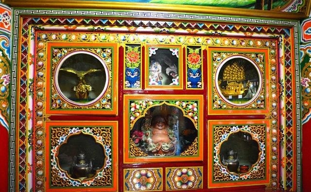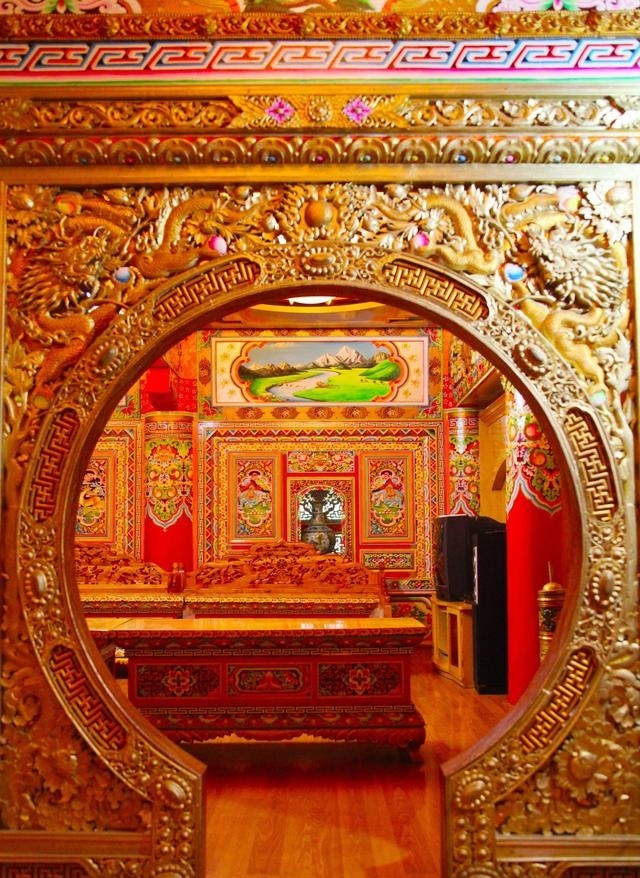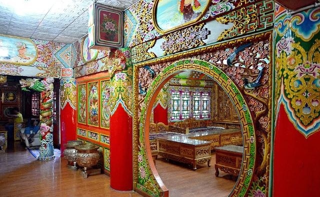 道孚民居室內(nèi)精雕細鏤,描金繪彩,每一個圖案或圖畫就是一個吉祥物或一個傳說。民居客廳陳設(shè)豪華,富麗堂皇,極顯主人的富有;經(jīng)堂供奉佛像,酥油燈長明,是家中的清靜之地;臥室多用箱式或椅式藏床,陳設(shè)溫馨而別具風情。