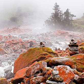 海螺溝的姊妹溝,位于海螺溝西北10 余公里的地方,周圍有15 座5000 米以上的高峰,從海拔2100 米逐次向上延伸至7556 米的貢嘎山主峰,目前還是一個鮮有人跡的地方。溝內的景色原始自然,特有的紅石溝和奇溝內的石頭千奇百怪,大面積的彩葉林帶更是秋天的寵兒。