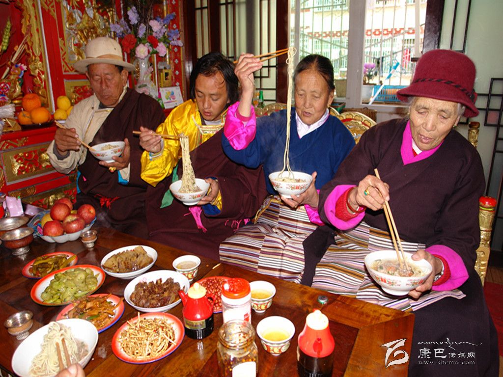 巴塘人一年當(dāng)中有很多重要的節(jié)日,而最重要的莫過(guò)于過(guò)春節(jié)。隨著農(nóng)歷新年的來(lái)臨,巴塘人過(guò)春節(jié)的氛圍也越來(lái)越濃烈了。掃塵、貼春聯(lián)、殺年豬、罐血腸、樹(shù)經(jīng)幡、獻(xiàn)“切瑪” 、曬牛肉干、做長(zhǎng)面、炸“花茹” 、 釀青稞酒等等。一時(shí)間,人們臉上綻放出春天的笑顏,讓人仿佛看到了春的腳步。在眾多的風(fēng)味飲食中,炸“花茹” 、 吃長(zhǎng)面(當(dāng)?shù)厝朔Q之為“金絲面”)是巴塘人春節(jié)時(shí)家筵中必不可缺的美食佳肴。