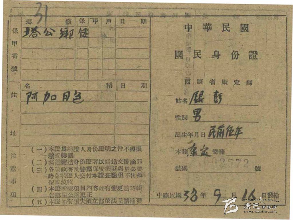 民國(guó)33年,即1944年,西康省民政廳制定《康區(qū)戶口清查辦法》,決定正式清查西康全省戶口。民國(guó)35年,即1946年,康定縣政府對(duì)康定全縣人口進(jìn)行統(tǒng)計(jì)。在1946年時(shí)候,全康定縣共8622戶、36797人,其中男性20889人、女性15908人(不含后重新劃歸康定管轄的所謂“金湯自治局”部分)。爾后開始發(fā)放“國(guó)民身份證”。發(fā)放工作斷斷續(xù)續(xù),延續(xù)數(shù)年,有的人領(lǐng)到,也有的人根本就沒看到過(guò)這種“國(guó)民身份證”。