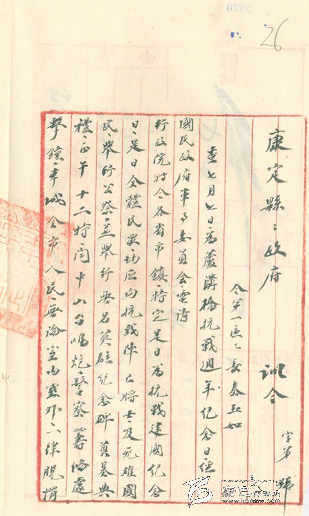 民國27年,即1838年7月5日,康定縣政府縣長杜履謙發(fā)出“訓(xùn)令”,內(nèi)容如下:“查7月7日為盧溝橋抗戰(zhàn)周年紀(jì)念日,經(jīng)民國政府軍事委員會電請行政院特令各省市、鎮(zhèn):特定是日為抗戰(zhàn)建國紀(jì)念日。是日全體民眾均應(yīng)向抗戰(zhàn)陣亡將士及死難國民舉行公祭,并舉行無名英雄紀(jì)念碑奠基典禮。正午12時,聞中山臺鳴炮,警察籌備處擊鐘,本城全市民,無論室內(nèi)室外,一律脫帽立正默哀五分鐘。禁止屠宰,素食一日。此令”。
