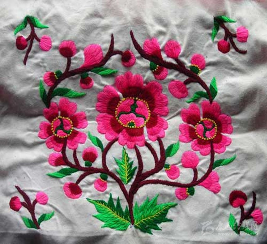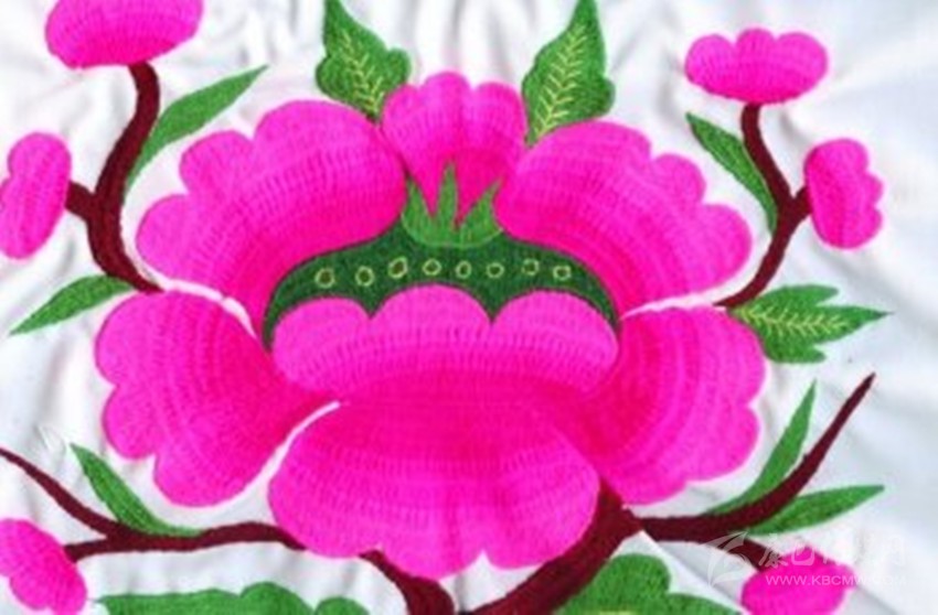 在魚通,刺繡以花朵為主。會繡花的女人,被稱為“花匠”?!靶』ń场眰儚氖鄽q就開始接觸刺繡,通過年長者口傳身授,自學(xué)的方式成為一代繡女。稚嫩的雙手,再經(jīng)過時(shí)間的洗禮,刺繡的技巧早已爛熟于心,在心的指引下,穿針引線,針尖如麥芒,各色陪底線來回,穿梭于布料的經(jīng)緯之間。買回青布,從下手的第一針開始,整幅圖的構(gòu)架便了然于心,各式花朵圖案成竹在胸,線條在暗自游走,勾勒越來越清晰。每一次的飛針走線,是婦人手上的一針針,一線線,都在為作品最后的完美收關(guān),錦上添花,做著必不可少的鋪墊。