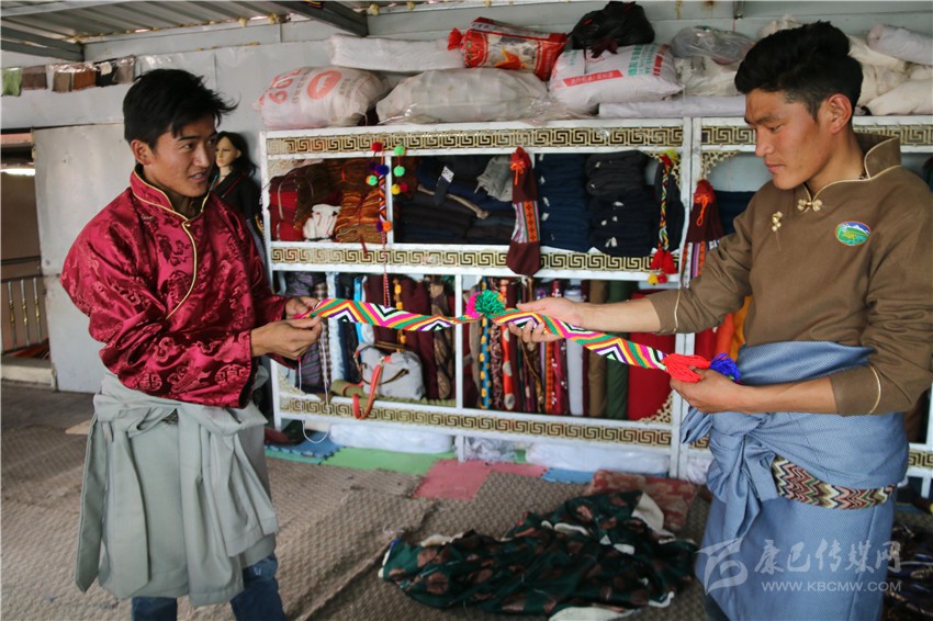 安孜鄉(xiāng)作為白玉縣海拔較高的鄉(xiāng)鎮(zhèn)之一,夏天是十分短暫的,連日來的晴好天氣,也透著絲絲寒氣。牧民阿剛想要量身定做一套過冬的藏裝,9月13日,他來到白玉縣阿察鎮(zhèn),一家民族服飾商貿(mào)公司吸引了他的目光?!拔覀冞@里的服裝面料是本地羊毛和從浙江進(jìn)的上等面料,做工考究,很多工序是純手工制作,服裝樣式你可以根據(jù)你的喜好指定,我們包你滿意?!钡陠T仁真熱情地介紹。聽了仁真的介紹,阿剛用手捻了一下服裝用料的質(zhì)地,看到印有“祥陽措”商標(biāo)的精美包裝袋,商店里擺放的五彩斑斕、高端大氣的藏式男女服裝,他有些動(dòng)心了。“生產(chǎn)這些服裝的都是我們納塔鄉(xiāng)的牧民,你可以考察我們的服裝用料、生產(chǎn)流程,再作打算?!比收鏌崆檠笠绲亟榻B說。