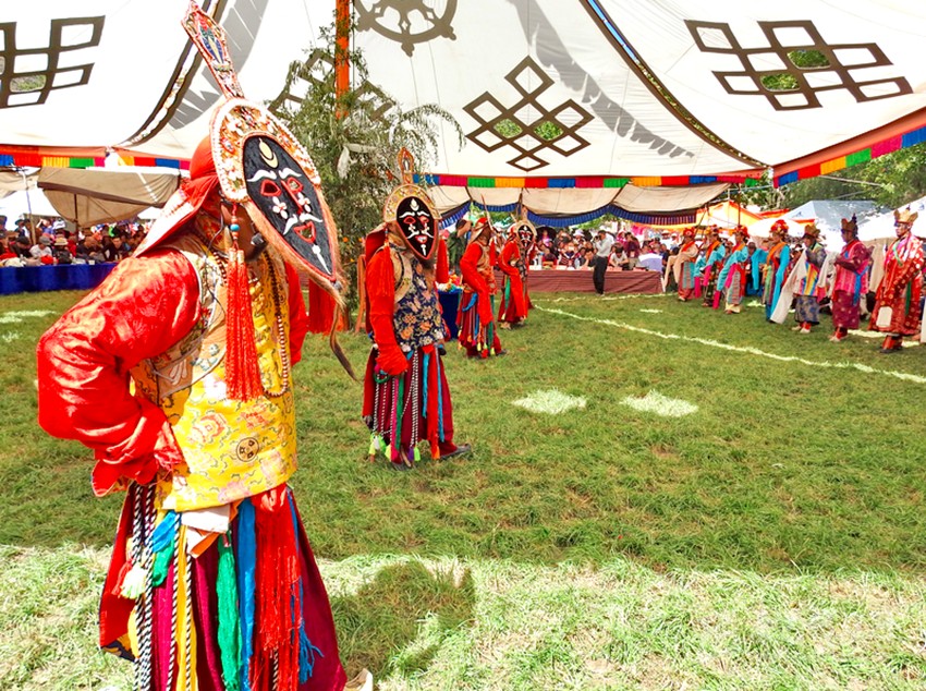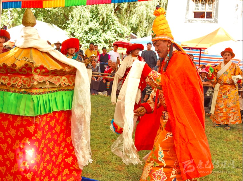 初次看到巴塘藏戲是康巴衛(wèi)視藏歷春晚,原以為是寺廟舞蹈,在唱聲杳杳里類似川劇的喉腔讓我覺得新奇,于是找些資料看看了巴塘藏戲介紹。藏戲的開山鼻祖唐東杰布。藏民歷來把他看作是創(chuàng)造藏戲的戲神和修建橋梁的鐵木工匠的“祖師”,是藏族人民心目中智慧、力量的化身。他將佛教經(jīng)典中的傳記同民間傳說、神話故事等內(nèi)容融在一起,創(chuàng)作出一種具有人物性格和舞蹈、唱腔相結合的表演藝術,使過去單一的跳神舞逐漸地戲劇化,表現(xiàn)手段也不斷加強,并從宗教儀式中分離出來,形成了藏劇藝術的雛形。