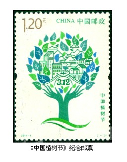 2019年是中國的植樹節(jié)設立40周年。3月12日,中國郵政發(fā)行一枚《中國植樹節(jié)》紀念郵票。郵票畫面以綠色為基調(diào),圖案主體為雙手托起的綠色家園,手臂代表樹干、張開的五指代表樹枝,寓意大家親自動手,植樹造林,為改善生活環(huán)境做出一份貢獻,同時也寓意人類是肩負改善地球環(huán)境重任的主要力量。樹干枝頭上方是生機盎然的綠葉,層層綠葉中設計點綴了象征城鎮(zhèn)、鄉(xiāng)村、河流、山川、藍天白云、飛鳥的符號化圖形,寓意通過全民植樹造林活動,改善生態(tài)和生活環(huán)境,共同創(chuàng)造綠水青山的美麗中國。