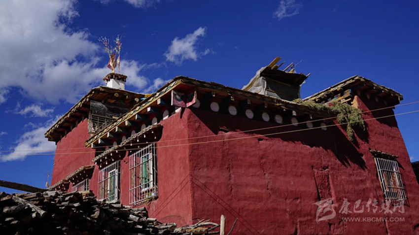 外裝飾也不繁復。外墻用磚紅色粘土調成泥漿上色,現在多用化學顏料。大門用一種叫“抓”的天然礦物質涂料,這種顏料容易染色,挨一挨都會讓衣服沾上絳紅色,現在也用化學涂料代替。二樓與“砸口樓”檐口處裸露在外面的木頭,用漆絳紅色顏料涂抹,支出來的小圓木涂白色顏料。遠遠望去,紅白相間,錯落有致,巴塘方言藏語稱之為“東椎”。檐口頂上用排成“人”字形的小青瓦點綴,窗框和門框都涂成絳紅色,也用“東椎”與青瓦裝飾;有條件的人家安裝雕花窗棱,嫌麻煩就用普通的大格子窗。外置庭院,種花植木,一座傳統(tǒng)的紅藏房便竣工了。