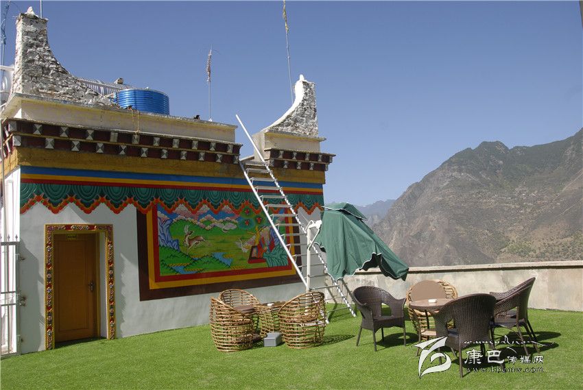 客棧的設(shè)計(jì)完全是藏式風(fēng)格,很吻合楊荻給客棧起的名字:圣地映像。從大廳開始一直到客房,金碧輝煌、雕梁畫棟,每一處空間都被藏地色彩充滿。樓頂,視野開闊,左手青山,右手青天。幾個(gè)內(nèi)江來的客人已在客棧呆了好幾天,他們正在燦爛陽(yáng)光下商量爬山的事,他們一再和楊荻碰面,希望晚上回到客棧能吃上本地的土雞。