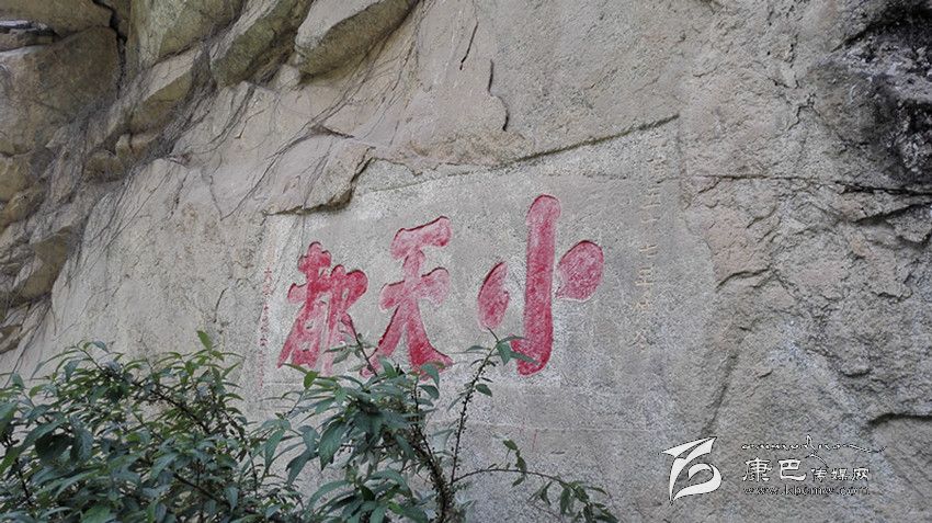 前些年,康定在此處修建水電站及公路,大量石塊隨意處置,沿路堆下,“小天都”三字幾被覆蓋。據(jù)當?shù)厝苏f,以前此三字高懸半空,現(xiàn)已可以攀巖而上。