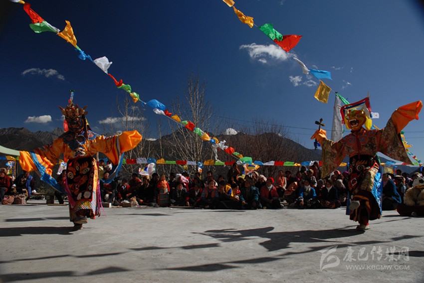 康巴藏傳佛教各派每年冬春都要舉行面具不同、內容各異的跳神祭祀活動,規(guī)模最大的數(shù)德格縣更慶寺的普巴多吉——《金剛撅童子》跳神。這一活動于藏歷每年元月中旬舉行,由僧人演出,連續(xù)兩天,是歷時十天的佛事活動的組成部分。屆時群眾從四面八方絡繹而至,上萬人匯聚于大壩爭相觀看,場面十分壯觀。