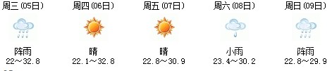 雖然明天太陽有點兇,但7日、8日、9日三天陣雨及時出現(xiàn),日最高氣溫穩(wěn)定在30℃附近。