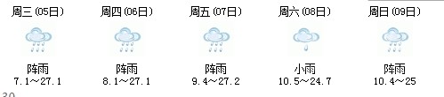 5日開始一直到9日都是多云到晴的天氣,日最高氣溫27℃左右。每天都有陣雨(小雨),考生出行應(yīng)防山地災(zāi)害。
