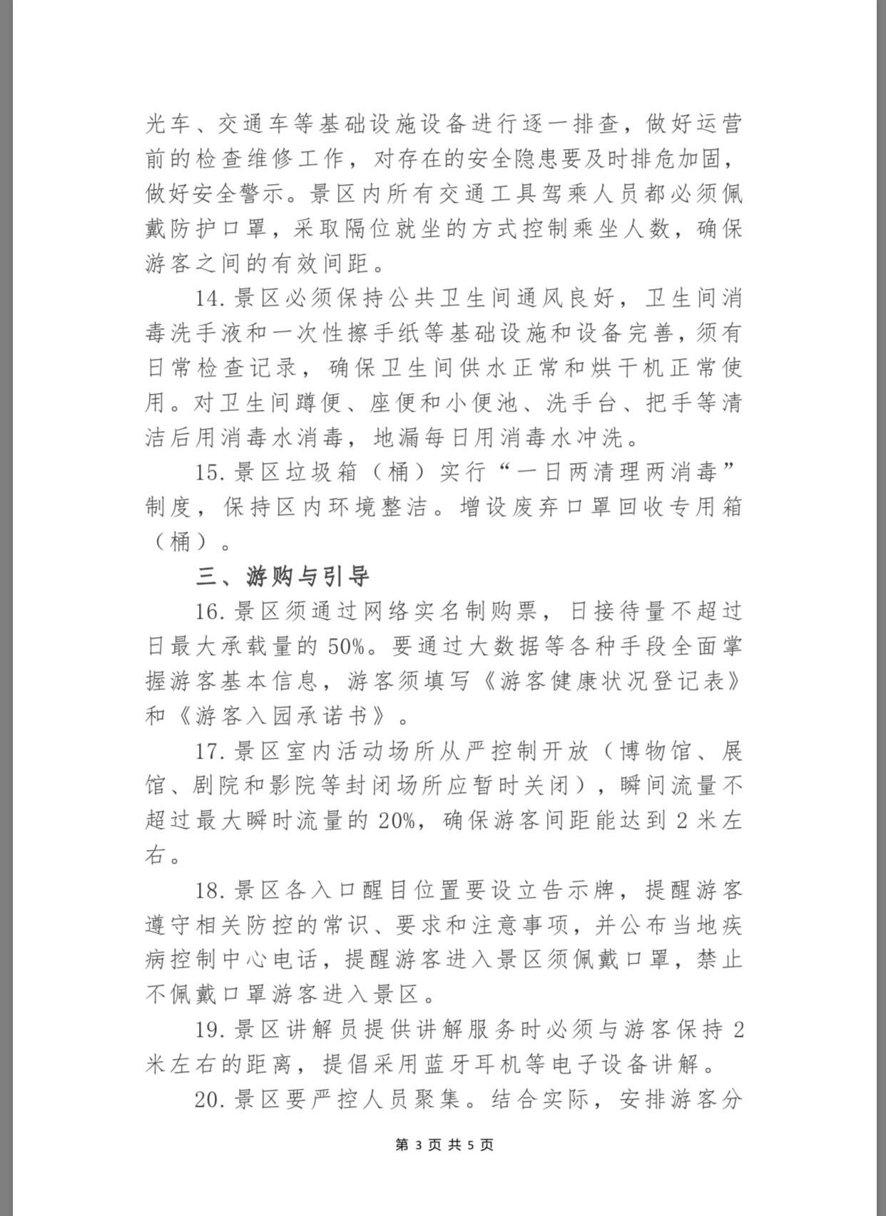 為保障景區(qū)安全有序恢復(fù)開放,景區(qū)游客服務(wù)中心和(志愿者或商業(yè))服務(wù)網(wǎng)點(diǎn)除放置免費(fèi)中英文防治新冠肺炎的宣傳資料外,還要放置“本中心已消毒”告示,應(yīng)備有75%的酒精棉球或其它消毒液等免費(fèi)供游客使用。同時,景區(qū)內(nèi)所有交通工具駕乘人員都必須佩戴防護(hù)口罩,采取隔位就坐的方式控制乘坐人數(shù),確保游客之間的有效間距,而垃圾箱(桶)則實(shí)行“一日兩清理兩消毒”制度,增設(shè)廢棄口罩回收專用箱(桶)。