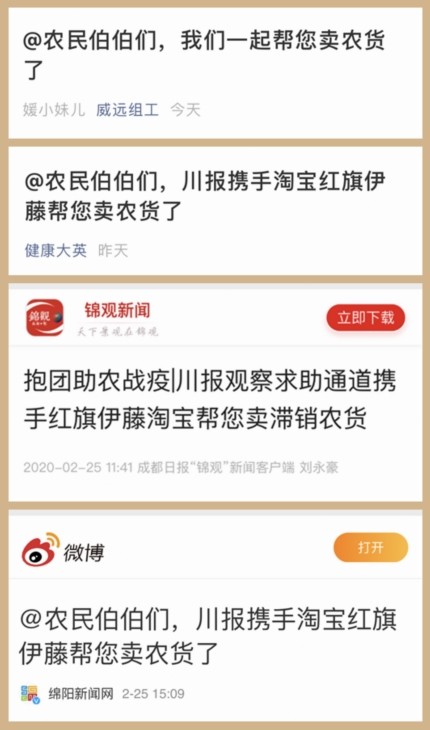 多地市州媒體及縣級(jí)融媒體中心的關(guān)注積極響應(yīng)參與活動(dòng)?!熬W(wǎng)信四川”公眾號(hào)、南充日?qǐng)?bào)“南充見”、成都日?qǐng)?bào)錦觀、眉山在線、開江發(fā)布、直播鹽亭、綿陽新聞網(wǎng)、宜賓日?qǐng)?bào)、威遠(yuǎn)組工、健康大英等均及時(shí)對(duì)活動(dòng)相關(guān)信息進(jìn)行了發(fā)布,及時(shí)把抱團(tuán)助農(nóng)戰(zhàn)疫活動(dòng)信息帶給當(dāng)?shù)赜行枨蟮霓r(nóng)戶。