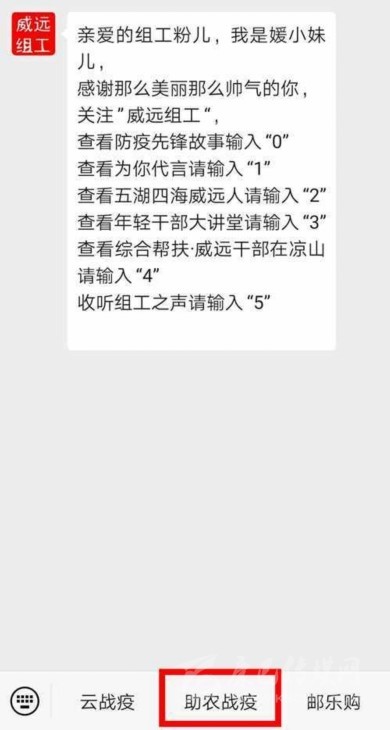 除了媒體之外,一些機(jī)關(guān)單位的政務(wù)新媒體也為活動(dòng)“站臺(tái)”,“威遠(yuǎn)組工”官方微信公眾號(hào)的底部菜單欄,特別新增了“助農(nóng)戰(zhàn)疫”專欄,直接連通川報(bào)觀察頁面,為當(dāng)?shù)剞r(nóng)戶及農(nóng)業(yè)經(jīng)營(yíng)戶提供解決難題的路徑。