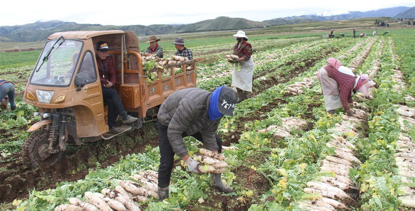 一根根白蘿卜,從理塘縣的沙礫地里,被農(nóng)牧民拔出來(lái),被迅速清洗、包裝,及時(shí)裝上排隊(duì)等候的冷鏈車。過(guò)雅江,翻折多山、二郎山,在雪域高原行駛四百公里后,抵達(dá)川西平原,再上成渝環(huán)線高速,后經(jīng)廈蓉高速,抵達(dá)珠海、深圳,進(jìn)入香港、澳門(mén)市場(chǎng)。