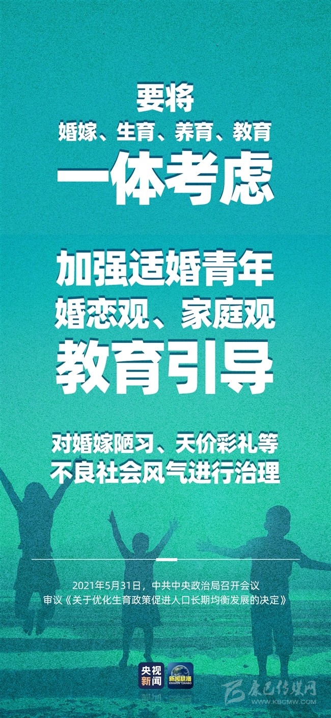 積極應(yīng)對人口老齡化,我國將出臺重大政策舉措。中共中央政治局5月31日召開會(huì)議,會(huì)議指出,進(jìn)一步優(yōu)化生育政策,實(shí)施一對夫妻可以生育三個(gè)子女政策及配套支持措施,有利于改善我國人口結(jié)構(gòu)、落實(shí)積極應(yīng)對人口老齡化國家戰(zhàn)略、保持我國人力資源稟賦優(yōu)勢。