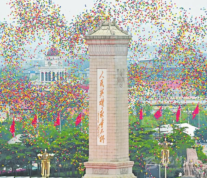 天安門(mén)城樓燈火璀璨,廣場(chǎng)上慶祝大會(huì)的準(zhǔn)備工作緊鑼密鼓。三軍儀仗隊(duì)、解放軍聯(lián)合軍樂(lè)團(tuán),還有北京各高校學(xué)生組成的合唱團(tuán),正在進(jìn)行最后的排練。