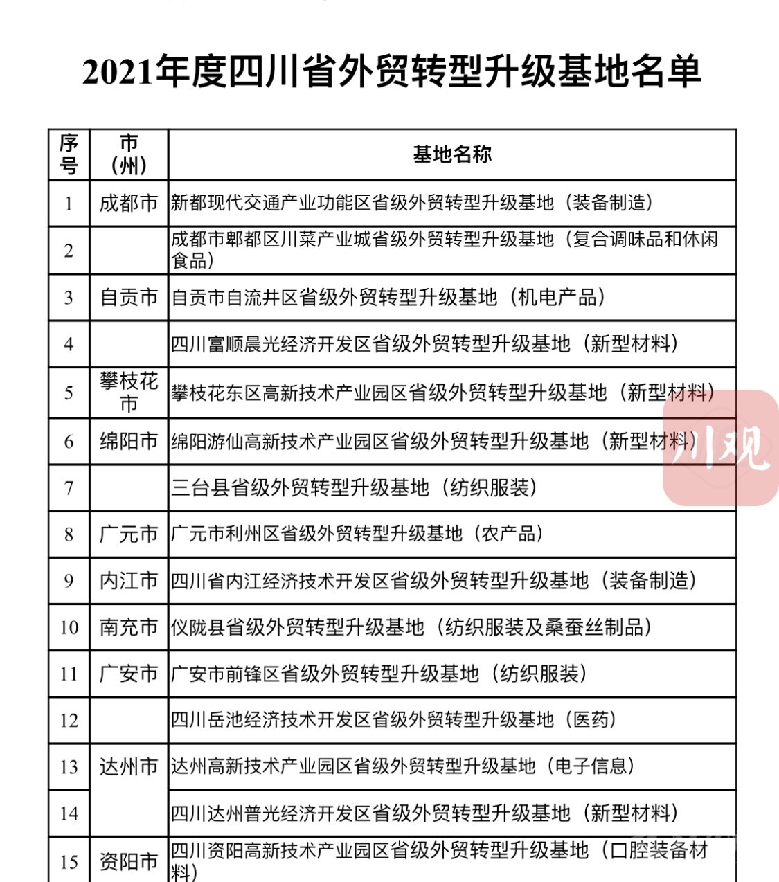 建設(shè)外貿(mào)轉(zhuǎn)型升級基地是穩(wěn)定和暢通外貿(mào)產(chǎn)業(yè)鏈、供應鏈、推進貿(mào)易高質(zhì)量發(fā)展的重要舉措。2020年,商務廳等省級9部門印發(fā)了《關(guān)于加快推進四川省外貿(mào)轉(zhuǎn)型升級基地建設(shè)的實施意見(2020—2025年)》,計劃用5年時間,在全省培育外貿(mào)基地40個。2020年,首批15個基地率先亮相。