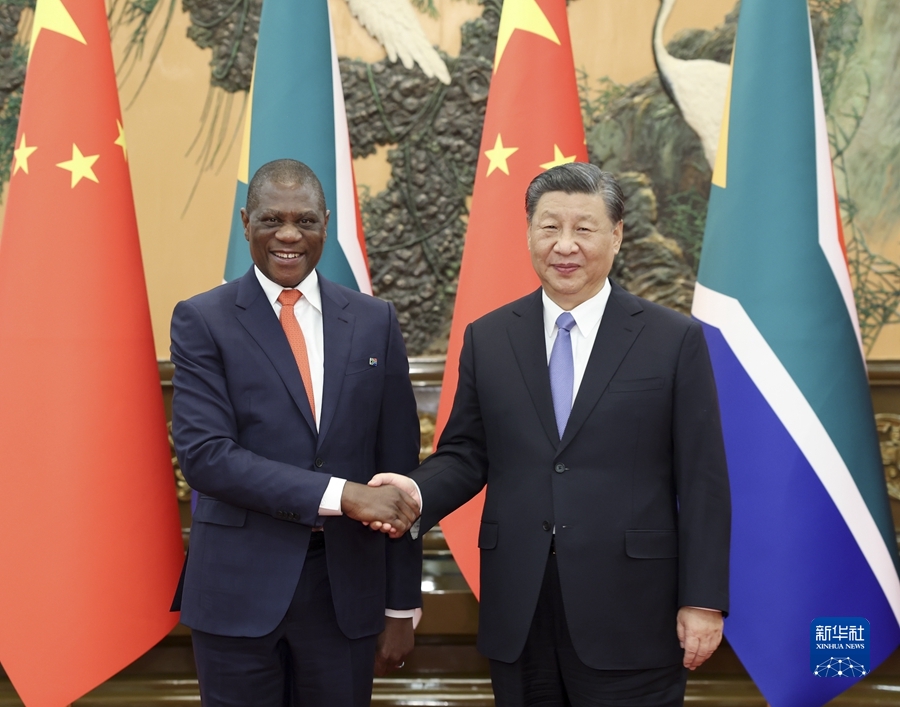 習近平強調(diào),中方支持南非探索符合本國國情的現(xiàn)代化道路,愿同南非進一步夯實政治互信基礎(chǔ),提升互利合作水平。中方愿同南非等非洲國家一道,落實中國支持非洲工業(yè)化、農(nóng)業(yè)現(xiàn)代化、人才培養(yǎng)三項舉措以及高質(zhì)量共建“一帶一路”的八項行動,打造一批高標準、惠民生、可持續(xù)的合作項目,提升中非合作的戰(zhàn)略性和可持續(xù)性,推動構(gòu)建高水平中非命運共同體。雙方應(yīng)繼續(xù)密切在金磚國家機制內(nèi)合作,加強發(fā)展中國家團結(jié)合作,推動全球治理體系朝著有利于發(fā)展中國家的方向發(fā)展。