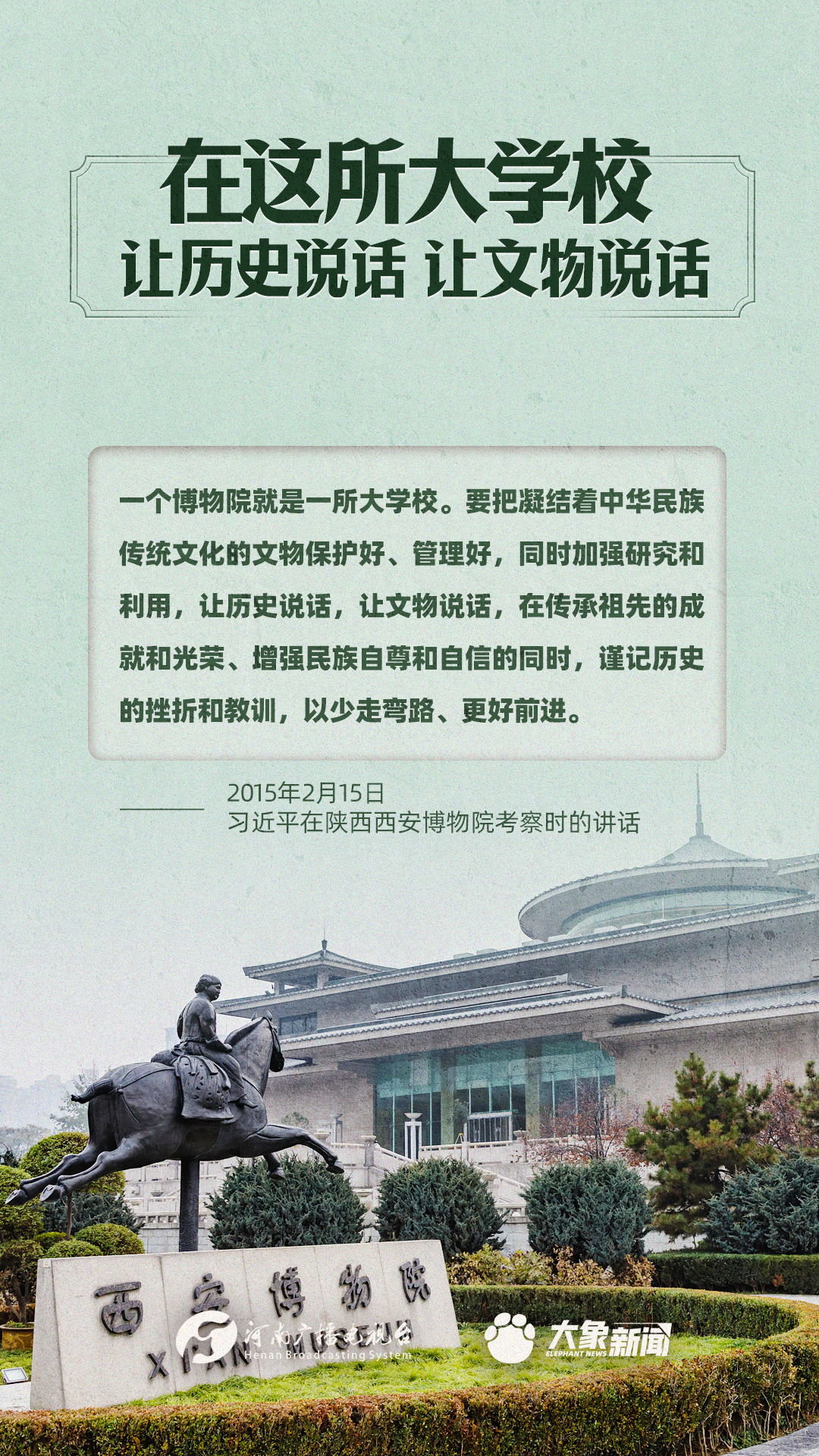 習近平總書記一直高度重視博物館工作,多次作出重要講話,強調(diào)“一個博物院就是一所大學?!保赋觥白寶v史說話,讓文物說話”,要求“守護好、傳承好、展示好中華文明優(yōu)秀成果”等等,金句連連。大象新聞進行了認真梳理,邀您一起學習。