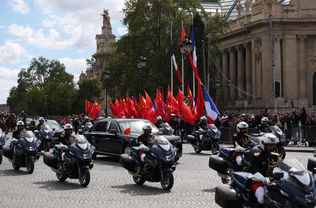 ??歡迎儀式后,習(xí)近平和夫人彭麗媛在共和國衛(wèi)隊(duì)148名騎兵組成的禮兵馬隊(duì)和摩托車隊(duì)護(hù)衛(wèi)下,乘車前往愛麗舍宮。