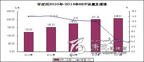 2014年,全州地區(qū)生產(chǎn)總值(GDP)達(dá)到206.81億元,按可比價格計算較2013年增長4.2%。其中,第一產(chǎn)業(yè)增加值51.48億元,增長4.6%;第二產(chǎn)業(yè)增加值77.20億元,增長2.4%;第三產(chǎn)業(yè)增加值78.13億元,增長6%。三次產(chǎn)業(yè)結(jié)構(gòu)為24.9:37.3:37.8。