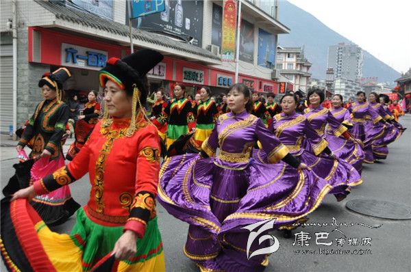 由瀘定縣弦子隊(duì)、金甘孜、色達(dá)協(xié)會、康定駐瀘協(xié)會組成的藏族方隊(duì);卡迪伲拉、北段社區(qū)、夕陽紅、瀘橋鎮(zhèn)演出隊(duì)組成的彝族方隊(duì);企業(yè)協(xié)會和教師協(xié)會組成的扇子方隊(duì);巾幗腰鼓隊(duì)和南段社區(qū)瀘園快樂隊(duì)組成的鑼鼓方隊(duì)等演出人員穿上節(jié)日的盛裝,與全縣人民喜迎新春。