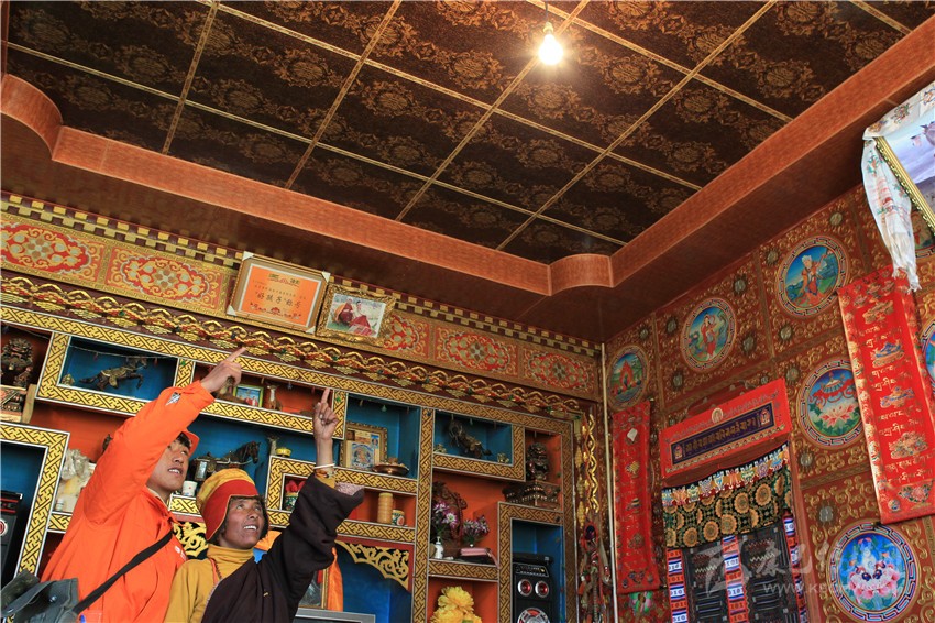 格吉大爺今年70歲了,他的孫子貢嘎是一名藏畫家,主要靠給鄉(xiāng)鄰的新房畫壁畫為生。他和哥哥兩人自學(xué)成才,鄉(xiāng)里很多人家屋內(nèi)那些精美絕倫的壁畫就出自他們兩兄弟之手。以前電不好時,天黑就無法工作,現(xiàn)在有電了,晚上都能畫,曾經(jīng)要畫1個多月的壁畫,現(xiàn)在20多天就能完成。如今電好了,電話信號也比以前強,好多理塘縣城的朋友都打電話請我去給他們家里畫,這樣又能多掙些錢。貢嘎的話語里透著對未來的幸福生活憧憬。