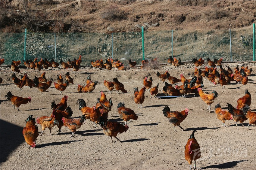 雄雞啼鳴鬧山谷,灣地溝村喜脫貧。12月9日上午10時許,當記者沿著通村水泥路來到距雅江縣城20多公里的呷拉鎮(zhèn)灣地溝村紅標雞生態(tài)養(yǎng)殖基地時,只見冬日暖陽下的洼谷山半山坡上,成群結隊的大紅公雞正在樹林下或覓食或展翅或歡歌。飼養(yǎng)員告訴記者:“別小看這3000多只活潑可愛的跑山雞,那可是村民心中的‘財富金雞’!”