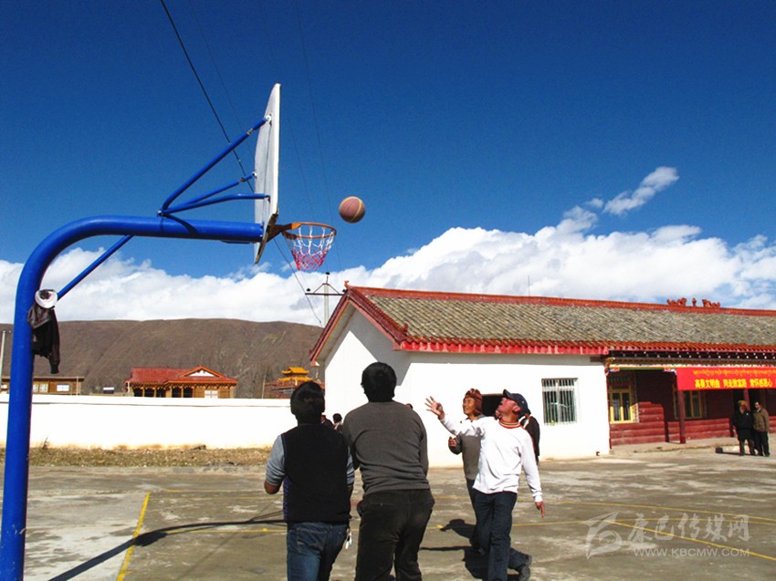 奪拖村村民在活動(dòng)室打籃球。