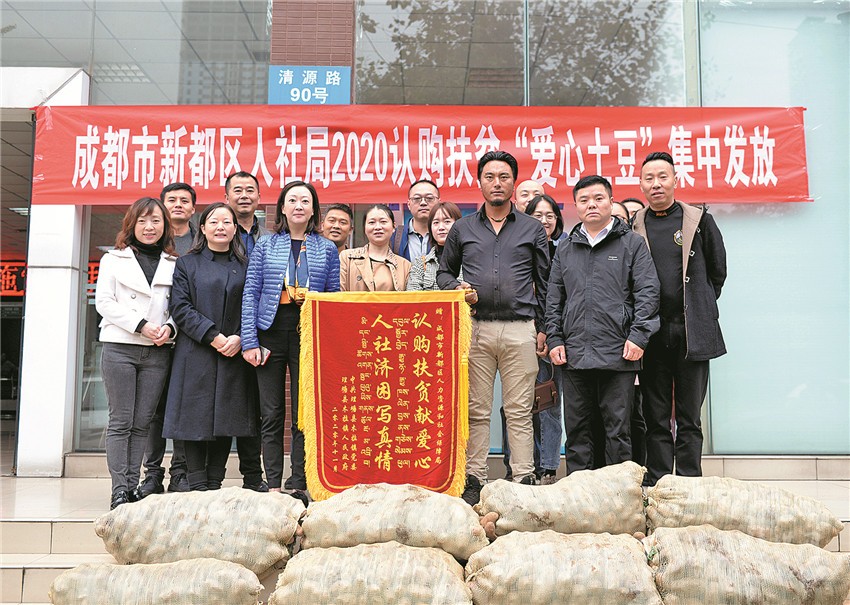 “感謝你們幫助認(rèn)購3萬余斤土豆……扎西德勒!”11月6日上午8點36分,“愛心土豆”車隊剛在新都區(qū)人社局停車場停穩(wěn),降央吉村一個躍步下車,為等候多時的人社局送上“認(rèn)購扶貧獻愛心、人社濟困寫真情”的錦旗。