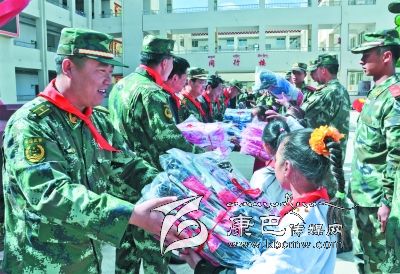 儀式上,8722部隊(duì)向?qū)W校贈(zèng)送了價(jià)值萬(wàn)余元的學(xué)習(xí)用品,拿著裝有鉛筆、水彩筆等各種文具的“愛(ài)心書包”,孩子們興奮不已。12歲的藏族女生登真啟珍告訴筆者:“今年的‘六一’兒童節(jié),武警部隊(duì)的叔叔們專門來(lái)看望我們,還送來(lái)了禮物,我感到特別開心。”儀式上,少先隊(duì)員們給參加慰問(wèn)的部隊(duì)領(lǐng)導(dǎo)戴上鮮艷的紅領(lǐng)巾,孩子們還表演了精心排練的節(jié)目。一張張燦爛的笑臉,一陣陣蕩漾心扉的歌聲,傳遞著駐訓(xùn)武警部隊(duì)與當(dāng)?shù)厝罕姖鉂獾聂~水深情。