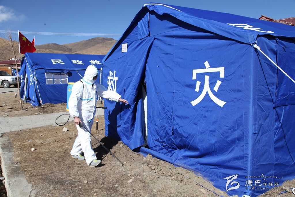 在離武警武警四川總隊二支隊的醫(yī)務站不遠的地方,新都橋中心衛(wèi)生院的衛(wèi)生員羅衛(wèi)強正“全副武裝”的為每一頂帳篷做著消毒。羅衛(wèi)強說:“我們從地震第一天到現(xiàn)在一直堅守在一線,22日到26日都在祖慶小學進行消毒工作,27日和其他工作人員換班到了江巴牧民新村安置點。我們每天會早上一次,晚上一次對每一間帳篷進行兩次消毒。除了我們,康定縣疾控中心的工作人員還會每天進行一次消毒,我們都在盡最大的努力保證牧民生活環(huán)境的衛(wèi)生。”在對環(huán)境進行消毒后,他又來到醫(yī)療就助點為前來就醫(yī)的甲瑪它看起病來。