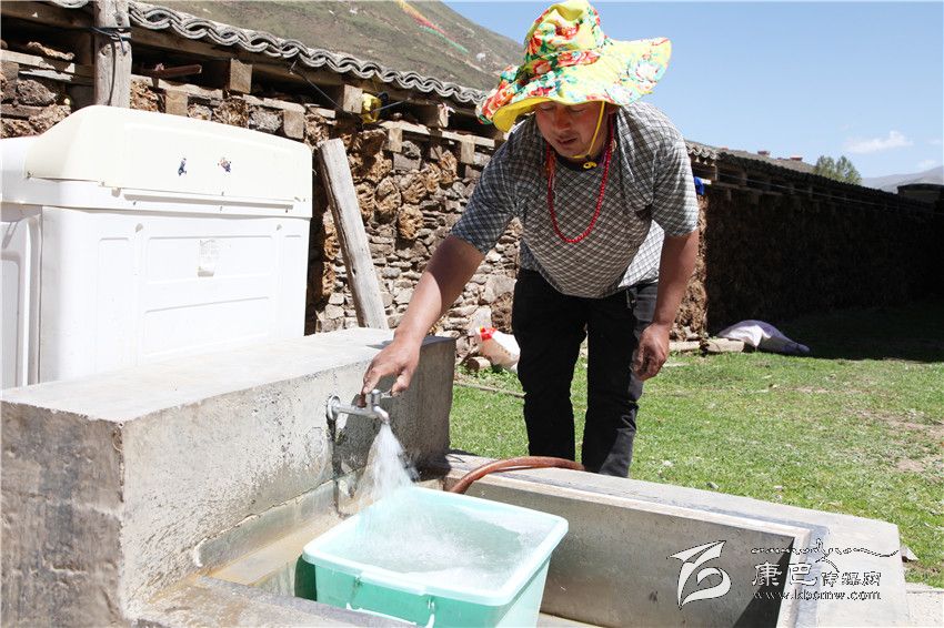 這是一幢位于半山坡上的漂亮藏房,這是一座寬敞干凈的農(nóng)家院落。正在院子里的水龍頭前洗衣服的布窮拉,一面羞紅著臉招呼著我們,一面將洗衣粉撒進(jìn)洗衣機(jī)里,高速運(yùn)轉(zhuǎn)的洗衣機(jī)不時(shí)拋出幾朵洗衣粉泡沫。說起自來水,不善言辭的布窮拉確實(shí)感觸尤深:“我家附近只住了4戶人家,根本就沒想過這輩子還能用上自來水。去年鄉(xiāng)上在實(shí)施第二批人口安全飲水工程項(xiàng)目時(shí),居然也把我們幾家規(guī)劃進(jìn)去了。當(dāng)時(shí),我以為只是說說而已,沒想到20來天后施工隊(duì)果真就把水管鋪設(shè)到了我家。通水那天,我們幾家人還特意慶祝了一盤。如今,我再也不用每天往返到色曲河背水了,我家的背水塑料桶隨之也就‘下崗’了。”