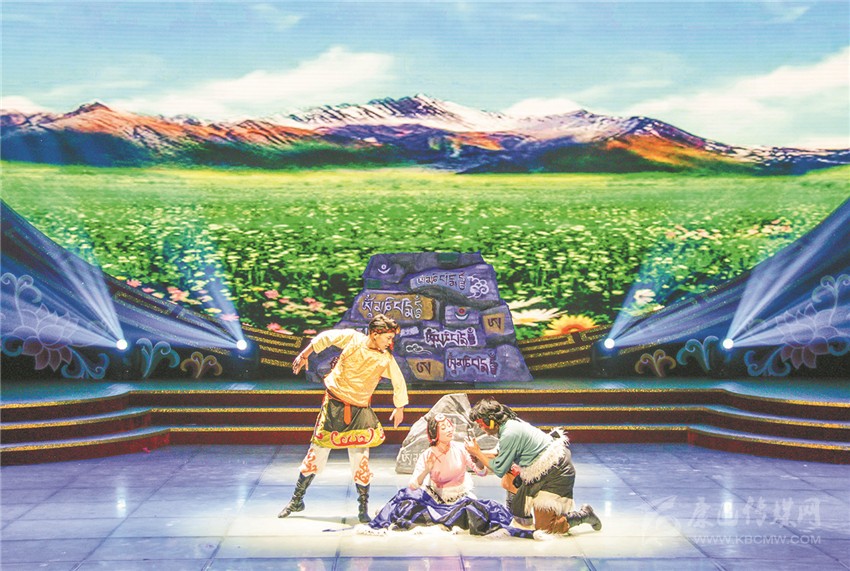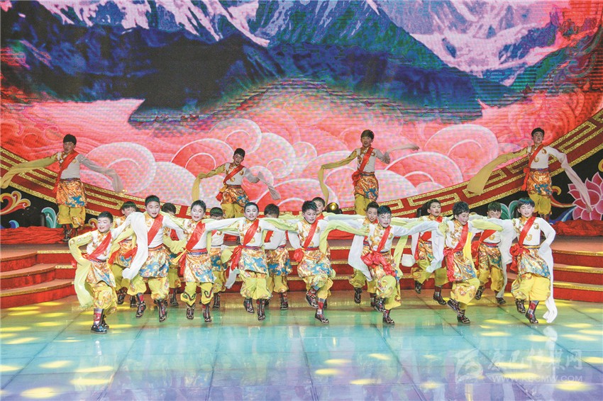 在團(tuán)拜會節(jié)目演出環(huán)節(jié),隨著主持人一句“柳綠枝頭待燕歸,金雞賀歲開門紅”脫口而出,20余名活潑、歡快的少年涌上舞臺,就著音樂的節(jié)拍,揮手踏足、左挪右轉(zhuǎn),翩翩起舞;少年們舞動的長袖映著縷縷斑斕的光束,依如雄鷹在拍打著飛翔的翅膀。這便是此次演出的開場節(jié)目《雛鷹飛翔》,一場絢麗多彩的“甘孜春晚”由此火熱開演。隨后,一群體態(tài)輕盈、妝如仙鶴的女子用靈動的舞姿為甘孜祈福,點(diǎn)明了此次團(tuán)拜會的一大主旨——祝福甘孜。
