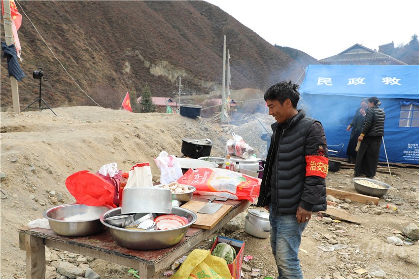 根秋尼瑪查看安置點的飲食衛(wèi)生情況。