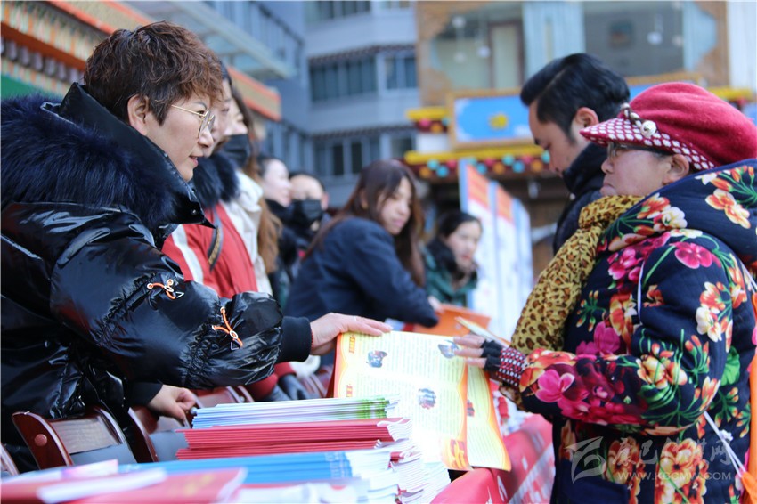 活動現(xiàn)場,工作人員為市民發(fā)放民族團(tuán)結(jié)進(jìn)步宣傳品、民族團(tuán)結(jié)進(jìn)步藏漢雙語宣傳教育讀本、宣傳畫、宣傳折頁、宣傳掛歷、《中國民族報》甘孜州民族團(tuán)結(jié)???、《民族》雜志甘孜州民族團(tuán)結(jié)??雀黝愋麄髻Y料9800余份(本),擺放展板30個。來自丹巴縣的仁真說:”現(xiàn)在的幸福生活離不開偉大的中國共產(chǎn)黨的領(lǐng)導(dǎo),也離不開全國各族人民共同團(tuán)結(jié)奮斗、共同繁榮發(fā)展?!?/p>