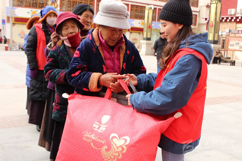 老人開心地接過(guò)志愿者發(fā)放的棉被。