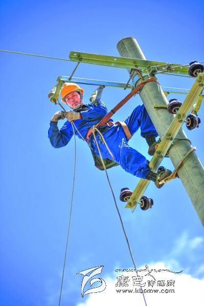 工人在長(zhǎng)須貢瑪施放導(dǎo)線。