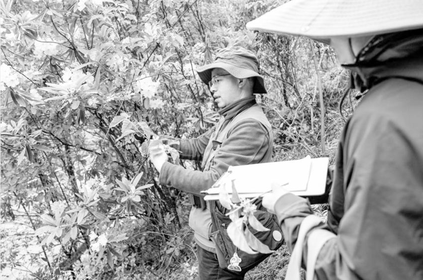 回到山腳,張遠彬正在打開植物“盲盒”?!斑@里海拔差別大,杜鵑的種類特別多,這是以前沒有記錄到的?!睆堖h彬直呼“驚喜”,邊用手機拍下形態(tài),邊口述特征讓一旁的助手記錄。