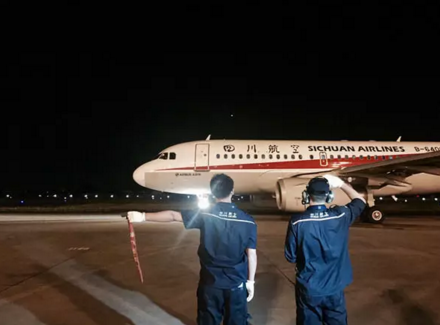 8月9日凌晨5時26分,民航第一個抗震救災加班航班——川航3U8111運送救災人員及物資,從成都起飛前往九寨,返程將接滯留旅客回蓉。