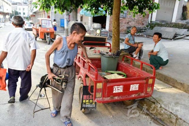 8月15日清晨不到7點(diǎn),在四川省南部縣中心鄉(xiāng)漏米巖村,周強(qiáng)善正將補(bǔ)鞋工具搬上機(jī)動三輪車,準(zhǔn)備從家出發(fā)去鄰近的長坪鎮(zhèn)集市趕場。攝影 張可凡